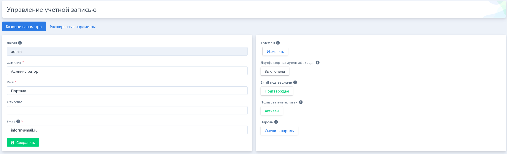 В базовых размещается информация о необходимых данных, касающихся непосредственно работы на Платформе, например, логине/пароле пользователя и адресе электронной почте.