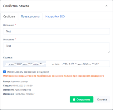 1. Во вкладке Свойства необходимо заполнить графы {Название} и {Описание}, так же есть возможность изменить адрес ссылки на отчет;