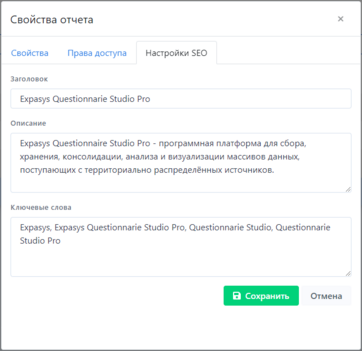 3. Во вкладке Настройки SEO есть возможность ввести информацию для настройки SEO в поля: Заголовок, Описание и Ключевые слова