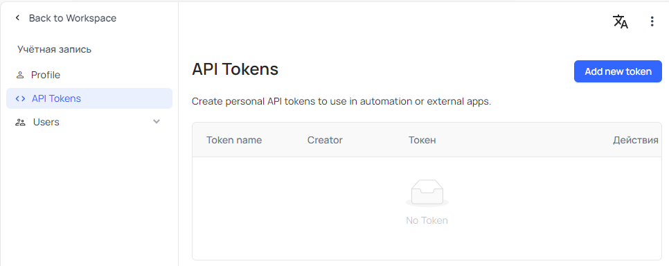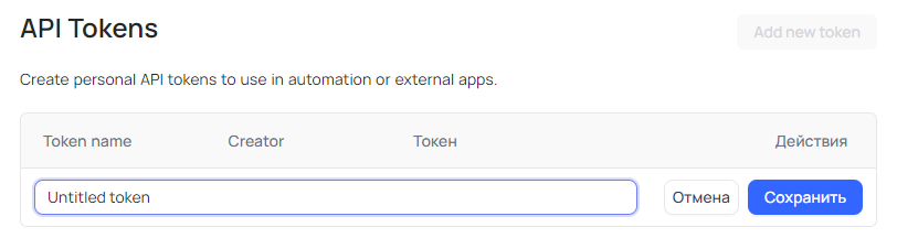 1. API токен - Token Management (Токены доступа).