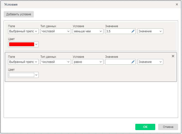 Для каждого нового условия необходимо определить параметры его применения. Цвет будет применен к определенному значению элемента, если условие выполниться.
