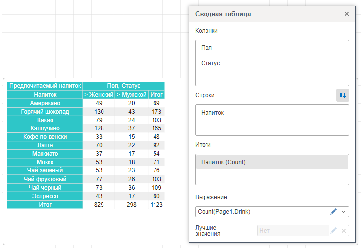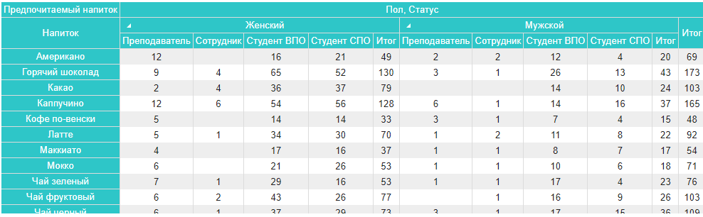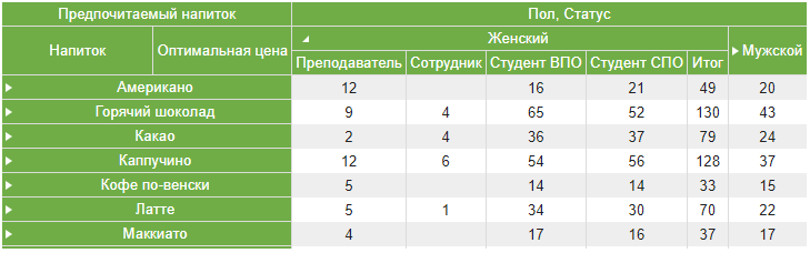В этом случае, в сводной таблице цена каждого напитка будет отдельной строкой в сводной таблице.