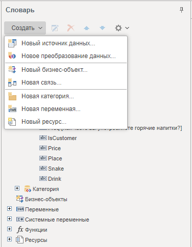 Для того чтобы создать трансформацию данных, необходимо в Словаре вызвать выпадающее меню в пункте Новый элемент и выбрать команду Новое преобразование данных... .