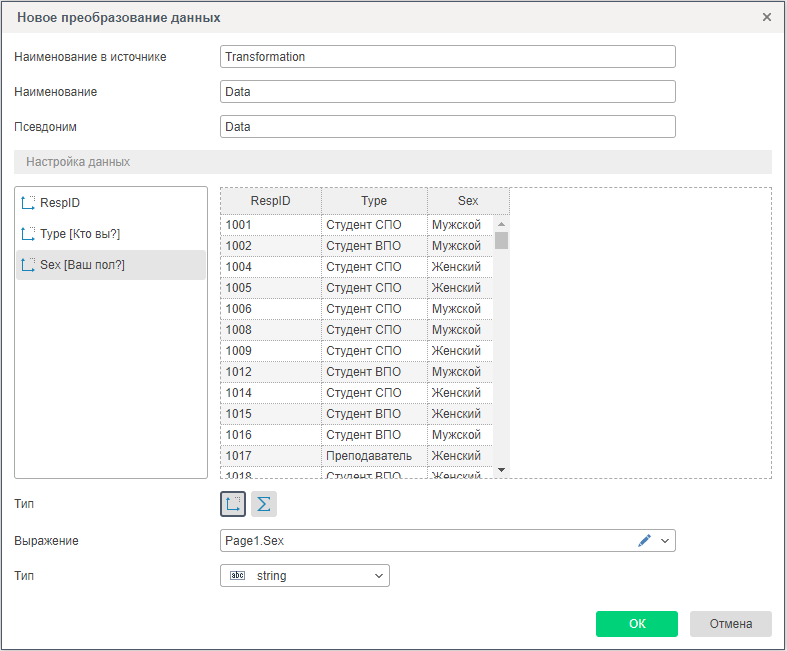 Данные выбираются также из Словаря данных, перетягиванием данных в окошко редактора Преобразования данных.