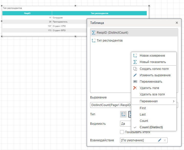 Изменение типа графы данных осуществляется в редакторе элемента Таблица, при помощи кнопок Показатель и Измерение: