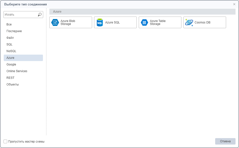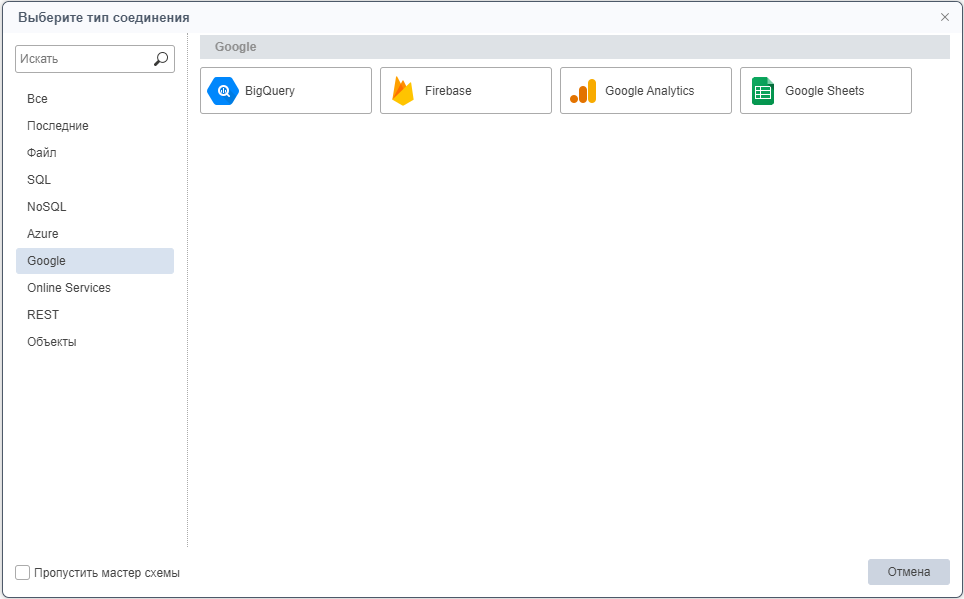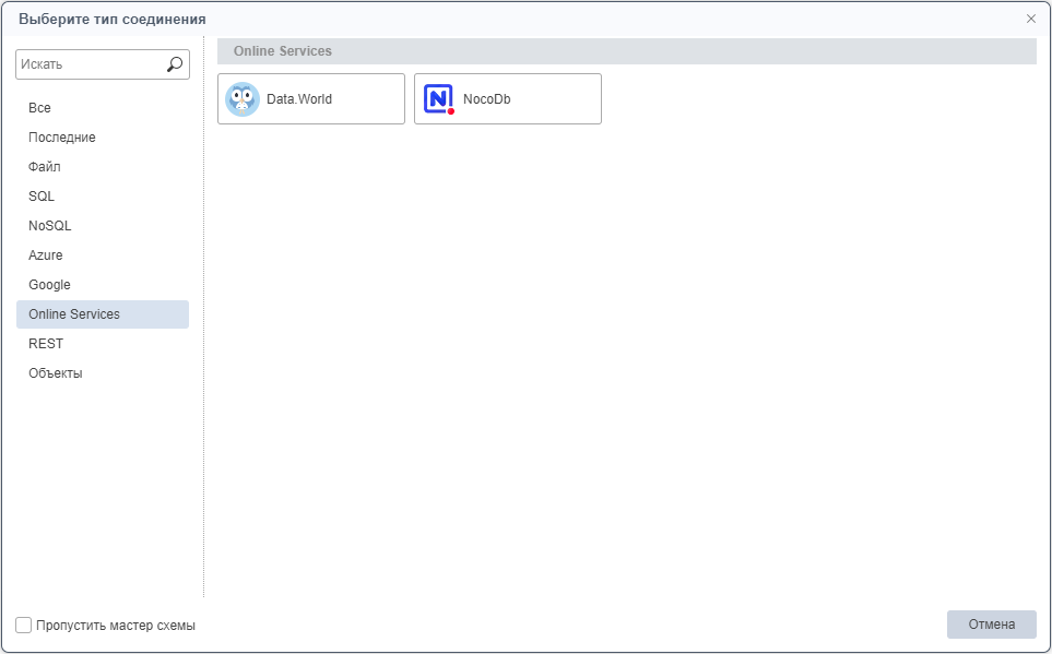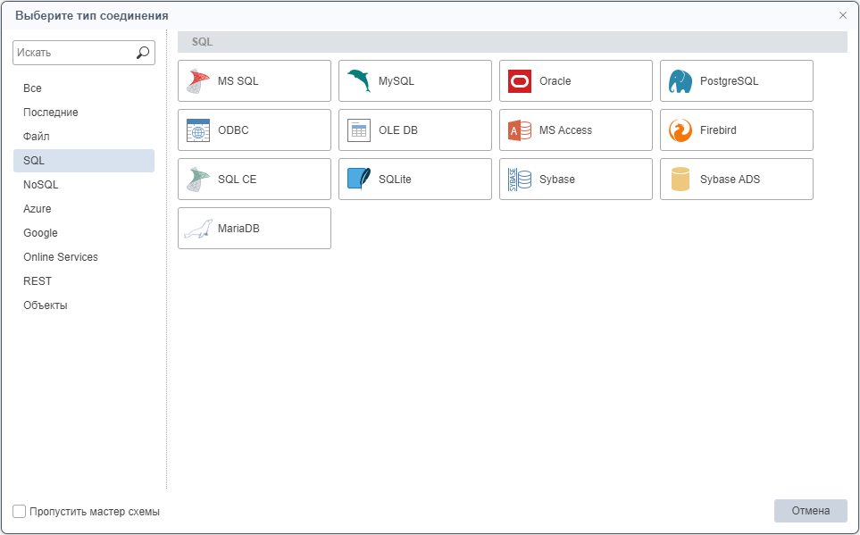 Прежде, чем будет создан новый источник данных, необходимо установить соединение с хранилищем данных. Для этого необходимо выбрать тип соединения в соответствующем окне: