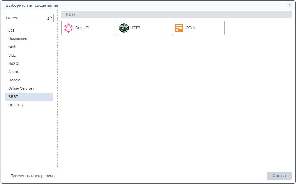 Группа REST - В данную группу входят виды подключения, относящиеся к стилю архитектуры программного обеспечения для распределенных систем REST. Таким видом подключения является HTTP подключение.