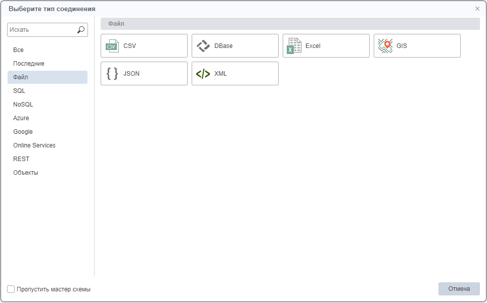 Группа Файл - В данной группе содержится список соединений к файлам различных форматов ( Excel, CSV и др.)