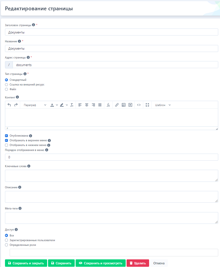 - пункт «Опубликована» - необходимо включить для того, чтобы страница была видна для всех пользователей Портала по прямой ссылке и в меню;