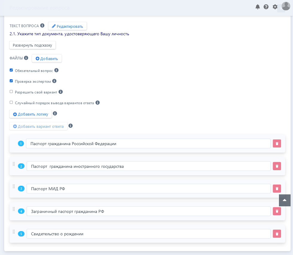 К этому типу вопроса можно прикрепить файл, выбрать пункт – обязательный вопрос (во время прохождения анкеты его нельзя пропустить), разрешить добавлять свой вариант ответа (отвечая на вопрос, пользователь сможет предложить свой вариант ответа), добавить случайный порядок вывода вариантов ответа (варианты ответа будут представлены случайным образом).