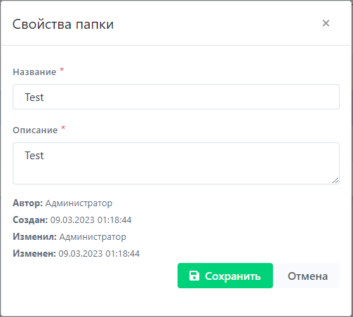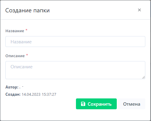 Для добавления папок нажать кнопку Создать папку и заполнить пункты в появившимся диалоговом окне: {Название} и {Описание}. Пункты {Автор} и {Создан}, заполняются системой автоматически.