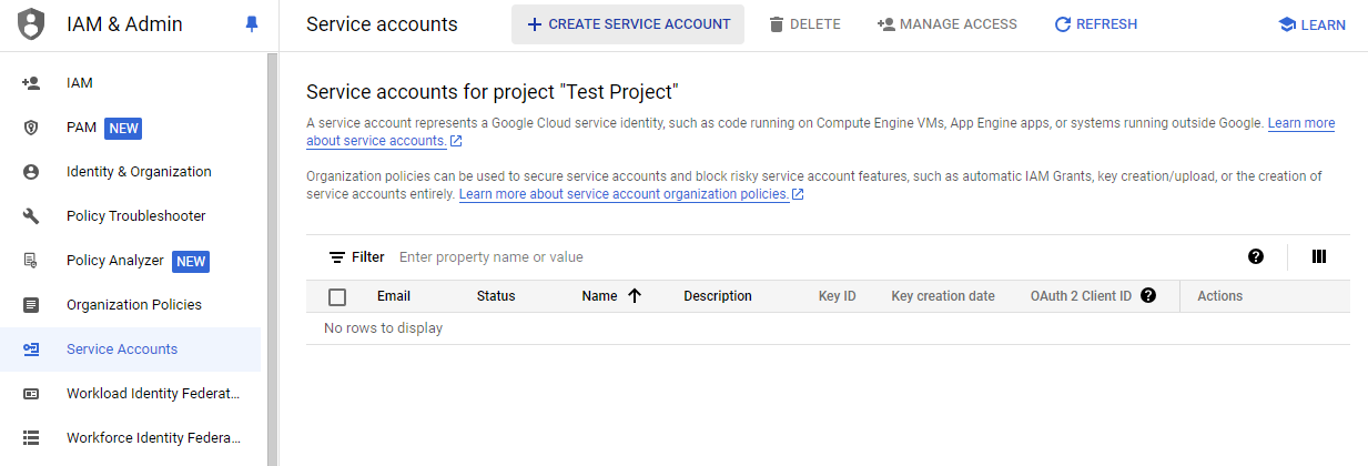 На странице этого раздела необходимо нажать на кнопку CREATE SERVICE ACCOUNT