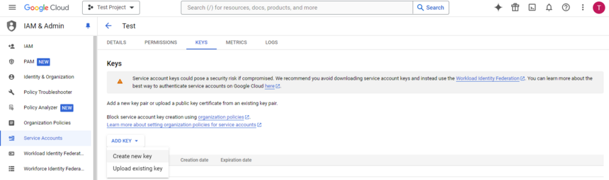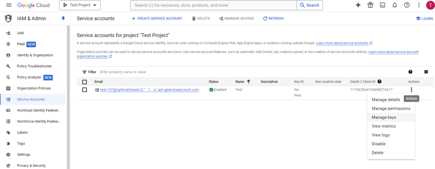 После создания аккаунта необходимо создать уникальный ключ и выгрузить его в формате json, для этого нужно: