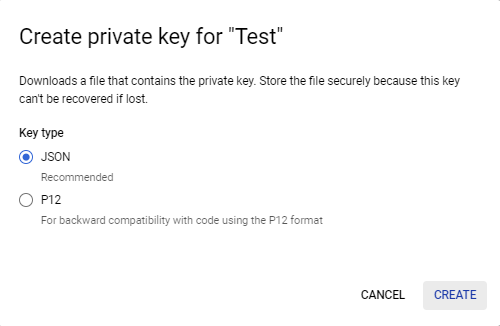В появившемся окне выбираем тип ключа: JSON и нажимаем кнопку CREATE