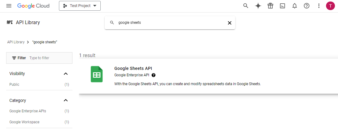 На данной странице следует выбрать требуемый API, для этого в строке поиска вводим Google Sheets и нажимаем Enter.