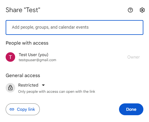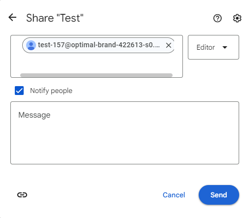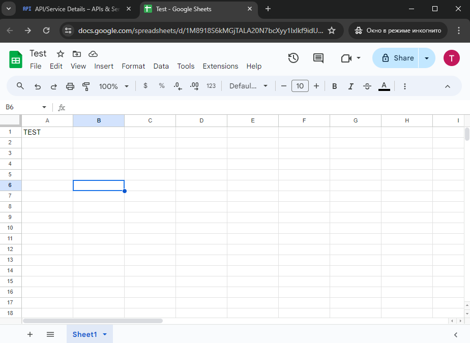 Для настройки доступа ранее созданного сервисного аккаунта, следует нажать на кнопку Share в правом верхнем углу страницы, после чего откроется окно в котором следует ввести адрес электронной почты созданного сервисного аккаунта (service account)