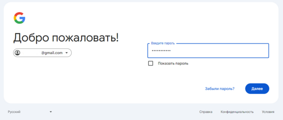 Для авторизации необходимо ввести логин и пароль от аккаунта (...@gmail.com).
