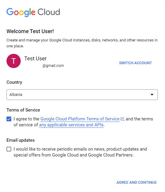 В появившемся окне следует выбрать страну из представленного выпадающего списка Country, а так же отметить галочкой поле о согласии с условиями использования платформы Terms of Service.
