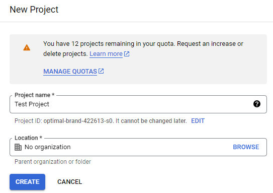 На странице создания проекта необходимо заполнить поле Project name - наименование проекта, а так же при необходимости поле Location для выбора организации.