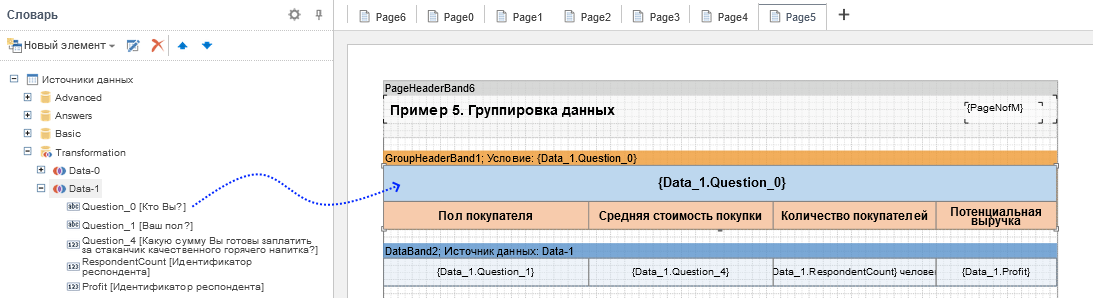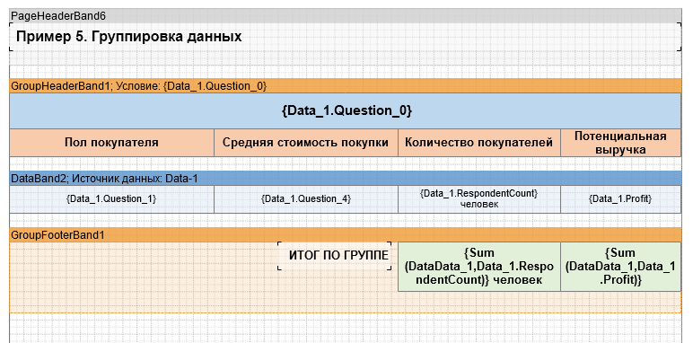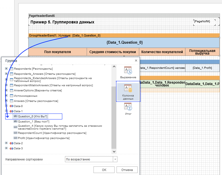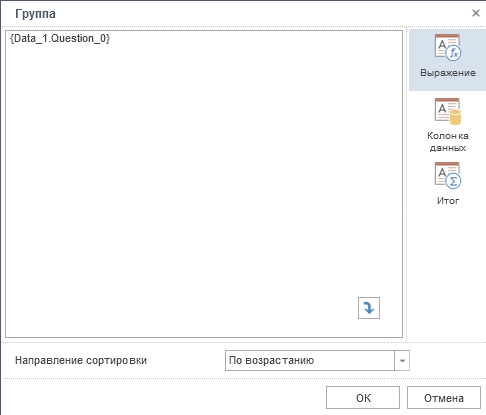 Для группировки данных по графе Выражение, в заголовок группы добавляется запись вида {Data_1.Question_0}.