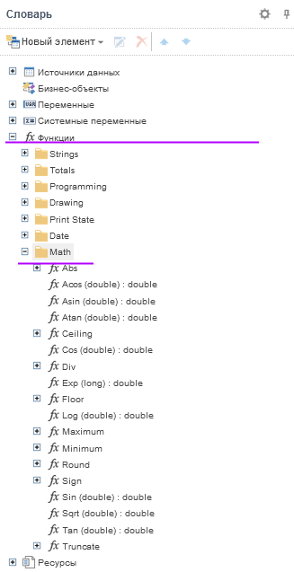 В словаре данных представлена отдельная категория Функции. В этой категории представлены элементы, при помощи которых можно рассчитать определенный результат или вернуть необходимое значение. Все элементы категории Функции разделены по группам.