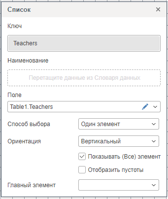 В поле Наименование указывается элемент данных, значения которого будут отображаться в элементе Список. Если наименование не задано, то в элементе список будут отображаться наименования ключей.