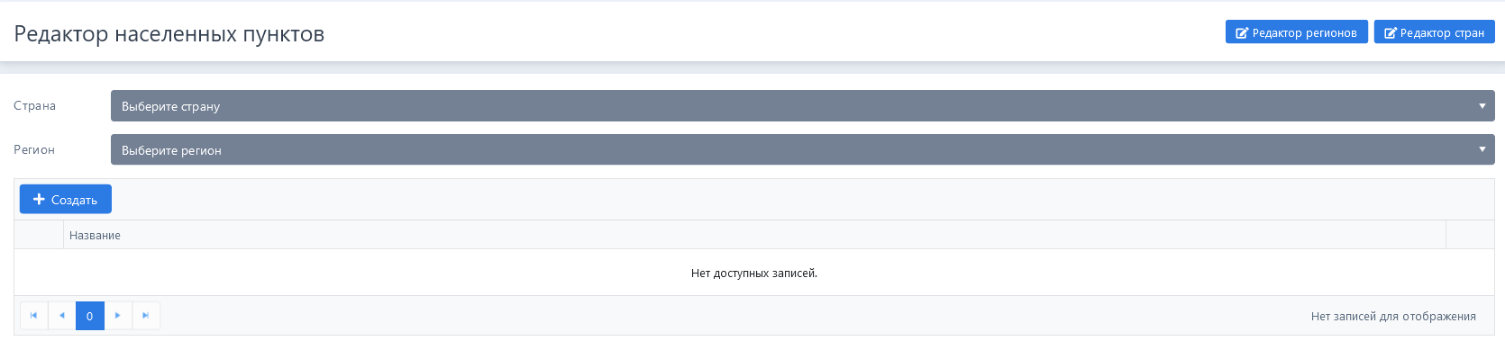 Для редактирования списка населенных пунктов, необходимо выбрать страну и регион из перечня.