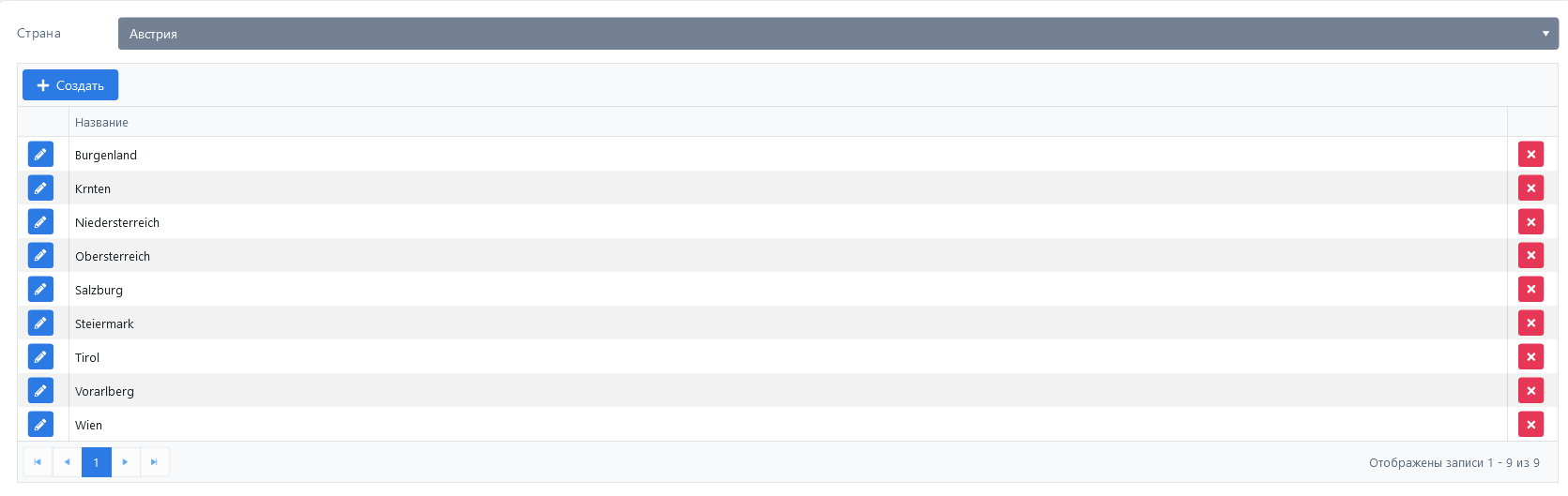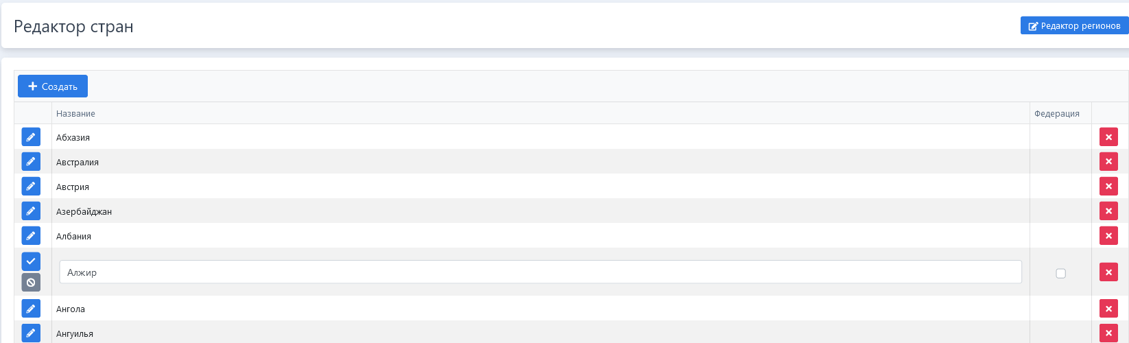 В данном разделе можно добавить, редактировать и удалить страну, а также редактировать регионы из списка.