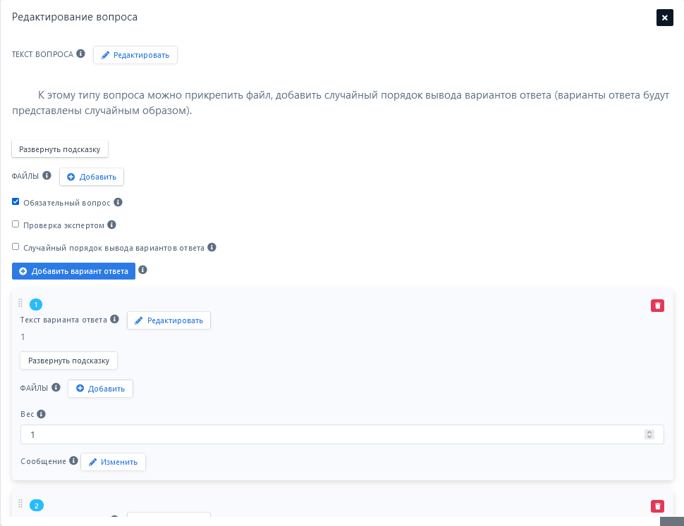 К этому типу вопроса можно прикрепить файл, добавить случайный порядок вывода вариантов ответа (варианты ответа будут представлены случайным образом).