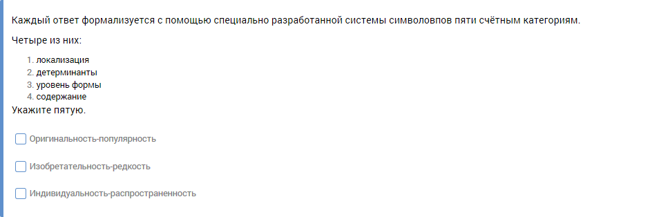 Данный тип вопроса применяется в случае, если предлагается выбрать сразу несколько вариантов ответа из предложенных. Ни один вариант не считается правильным или неправильным.