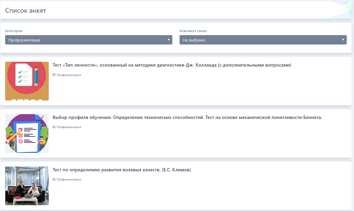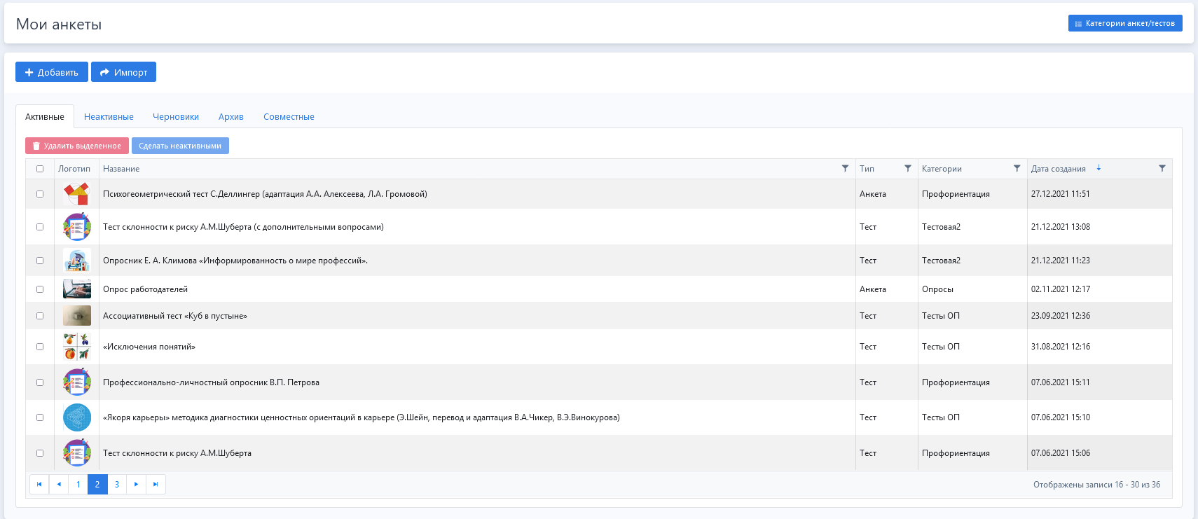 В этом разделе размещен список всех анкет и тестов, которые были размещены пользователем.