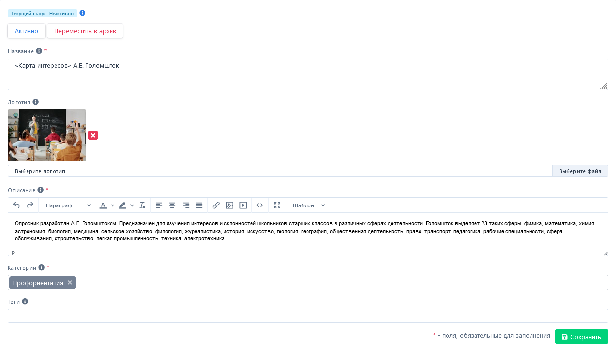 Настройки анкеты. Статус - Неактивная