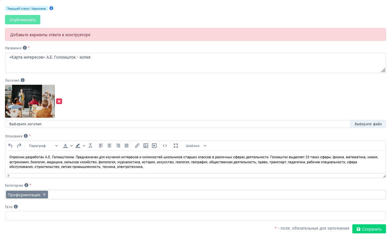 Настройки анкеты. Статус - Черновик