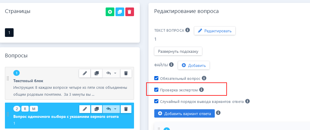 Эксперт - проверяет ответы пользователей теста, при наличие вопросов требующих ручной проверки.