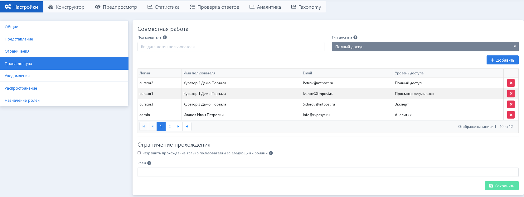 Полный доступ - полноценный соавтор анкеты, обладает полным доступом к настройкам, конструктору и анализу результатов.