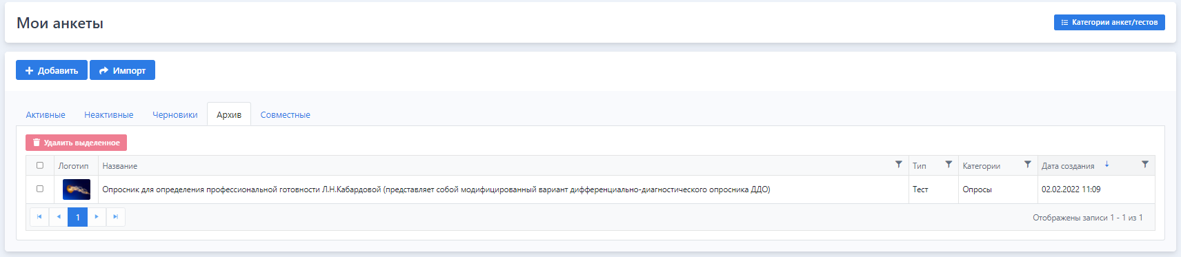 Во вкладку Совместные добавлены все тесты и анкеты, которые создаются совместно с другими пользователями Платформы.