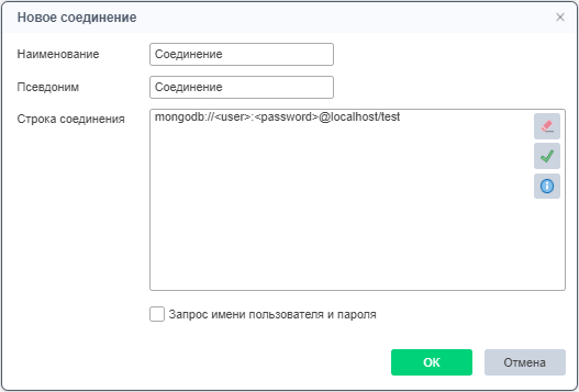 Кнопка Строка соединения. Нажав на кнопку Строка соединения есть возможность получить шаблон строки соединения, который заполняется пользователем, используя актуальные данные.Так же есть возможность включить / выключить параметр Запрос имени пользователя и пароля.После нажатия кнопки Строка соединения мы получим шаблон строки соединения к базе MongoDB:
