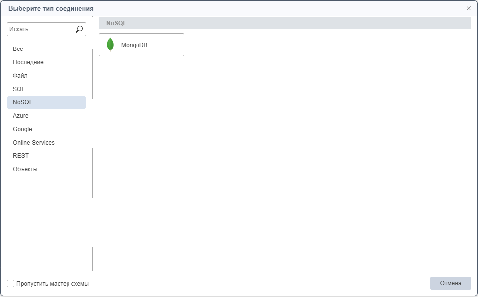 Рассмотрим создание подключение к NoSQL базе MongoDB. При выборе типа соединения MongoDB откроется окно с формой Новое соединение: