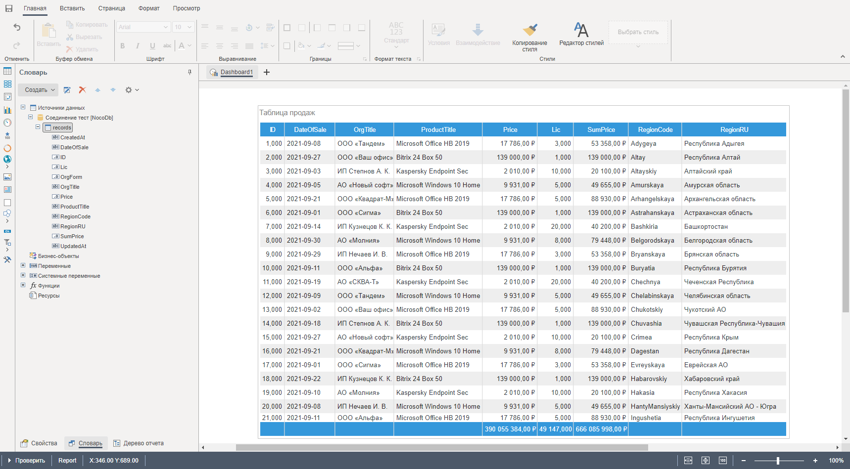 После подключения источника данных в Expasys BI, во вкладке Словарь будут доступны его компоненты, использующиеся для построения аналитических отчетов и панелей индикаторов: