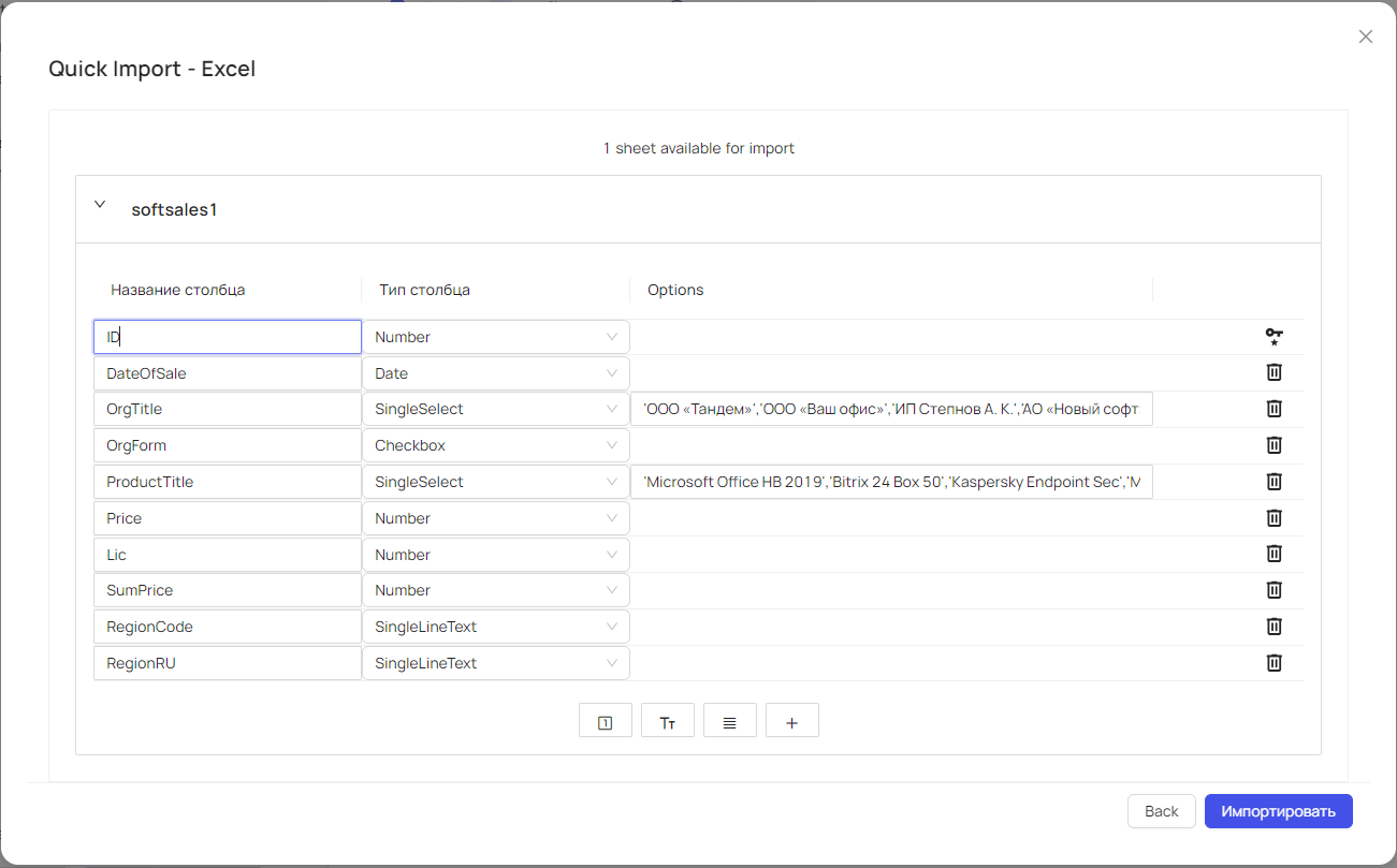 Теперь при выборе импортированной таблицы в левой части экрана откроется рабочая область содержащая редактируемые поля: