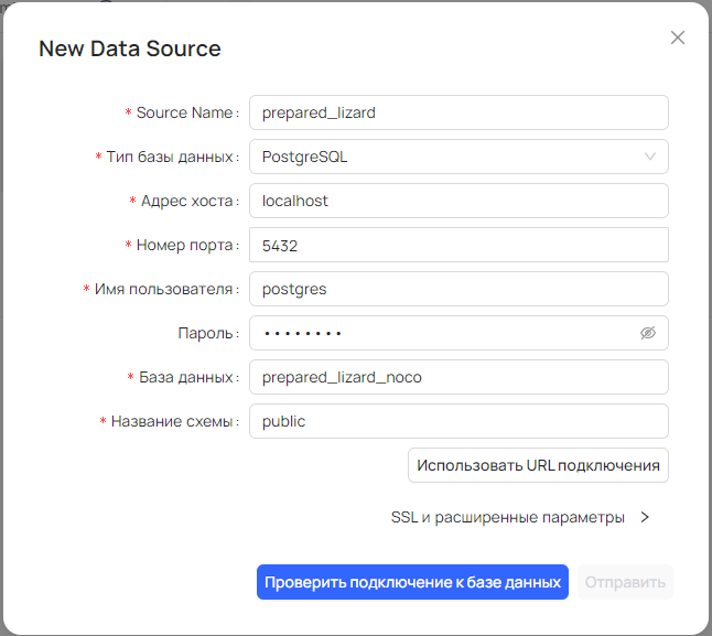 Во всплывающем окне New Data Source следует заполнить поля, необходимые для подключения к созданной базе: