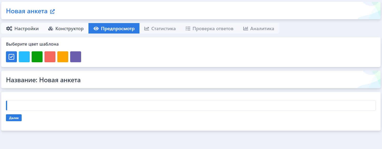 Настройка внешнего вида опроса На вкладке Предпросмотр анкеты, можно предварительно просмотреть создаваемую анкету, а так же задать стилистическое оформление – выбрать цвет шаблона. Отображение цвета шаблона «Синий» при прохождении анкеты