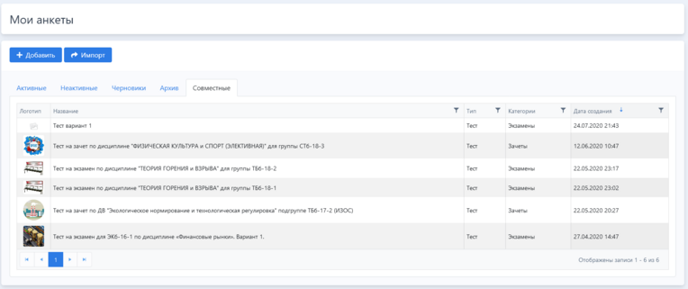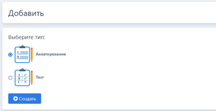 Для создания новой анкеты необходимо нажать кнопку Добавить, выбрать тип {Анкетирование/Тест} и нажать кнопку Создать.