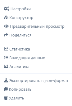 У каждой созданной анкеты есть свое меню, которое всплывает при нажатии на кнопку
