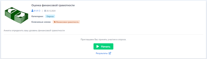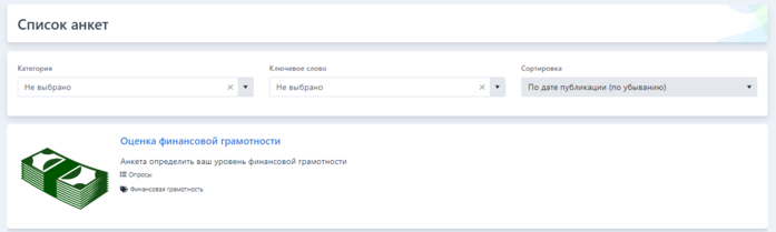 Для прохождения опроса пользователем, тест/анкета должны быть Опубликованы, т.е. размещены на Портале в разделе «Список анкет».