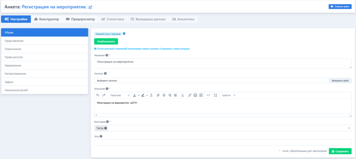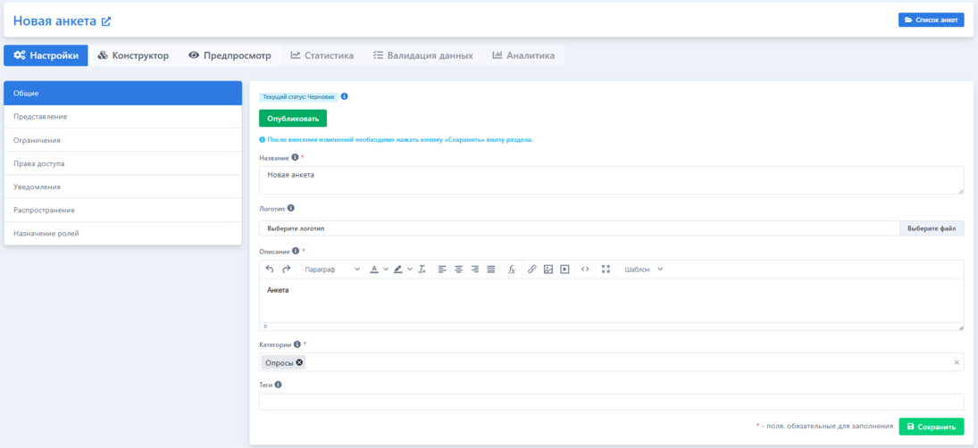 При добавлении новой анкеты, её текущий статус будет отображен как Черновик. Для анкет с данным статусом недоступны вкладки Статистика, Валидация данных и Аналитика.