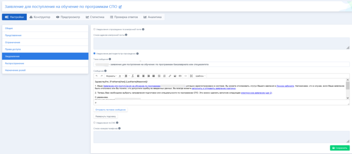 Отображение настроек анкеты. Вкладка «Уведомления»