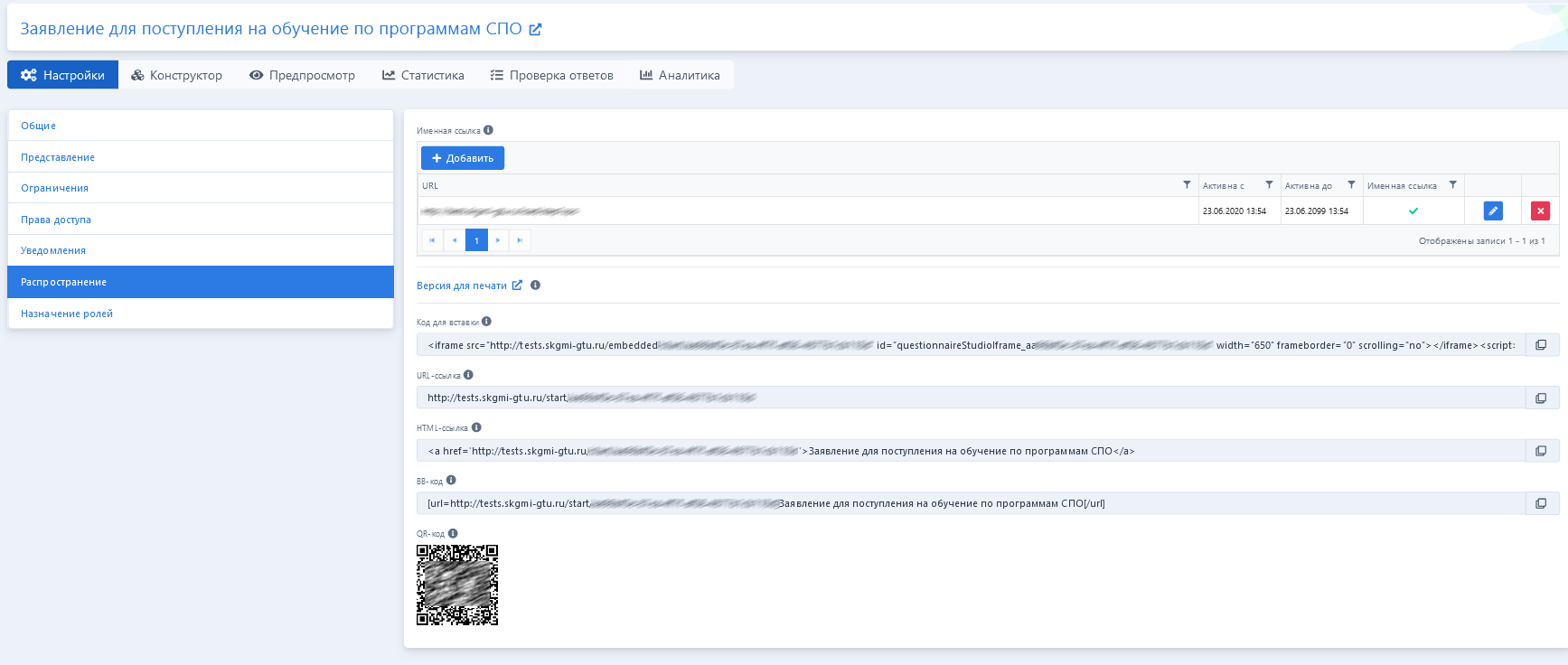 В данной вкладке настраиваются различные ссылки для распространения анкеты.
