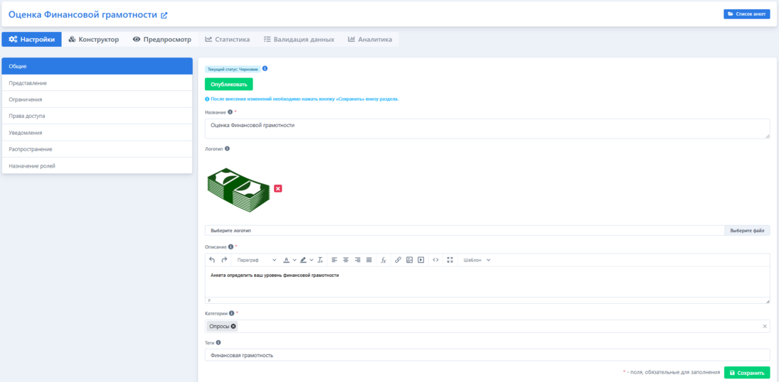 После заполнения всей необходимой информации, настройки всех вопросов и сохранения всех изменений (кнопка Сохранить), анкету необходимо Опубликовать, используя соответствующую кнопку: