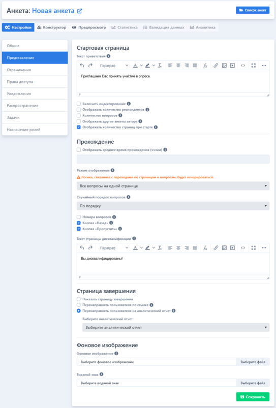 Настройки представления анкеты разбиты на следующие блоки для настройки: Стартовая страницы, Прохождение, Страница завершения, Фоновое изображение.